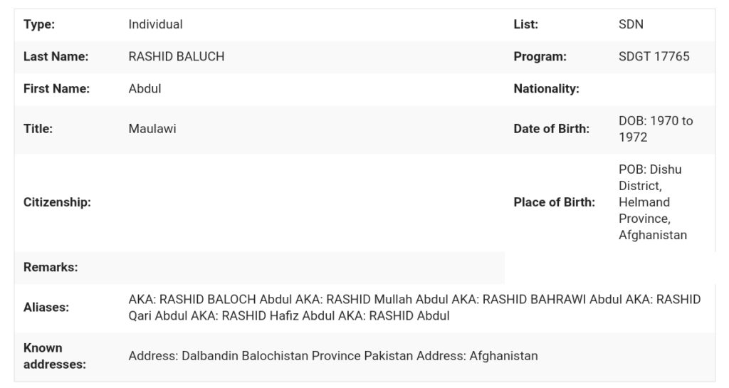 What has drawn attention to this latest release is the notoriety of one Taliban figure in particular: Abdul Rashid Baluch, who was on the United States Treasury Department’s “Specially Designated Global Terrorist” list and was arrested in a narcotics raid five years ago.