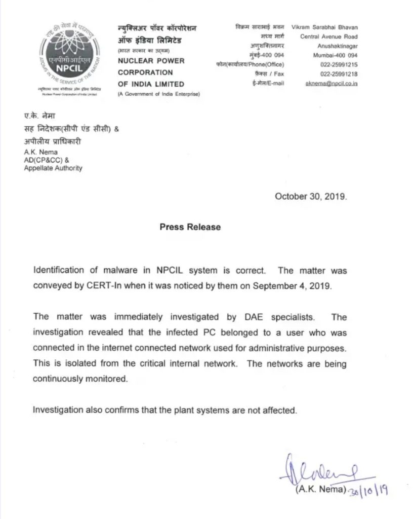 After #cyberattack while NPCIL officials have admitted to their administrative system being breached by malware, actual damage assessment is yet to be determined. Meanwhile #cybersecurity community is concerned whether India's #thorium secrets got stolen. https://t.co/akI7nVOQCm
