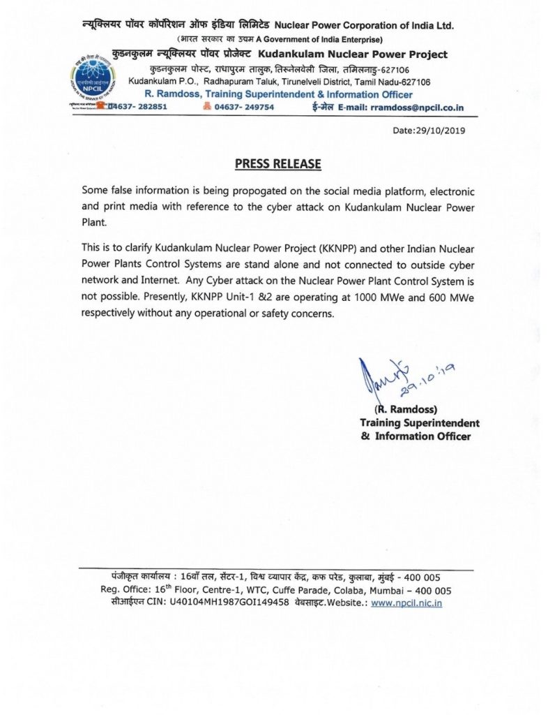 Although an official statement from a low-level official from KNPP denied the incident claiming, since the “control systems at India’s power plants are not connected to the Internet, any cyber strike is impossible”.