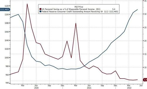 And just to remind you, the so-called strong consumer is depleting their savings at a virtually unheard-of rate while using credit cards to pay for their skyrocketing living expenses.