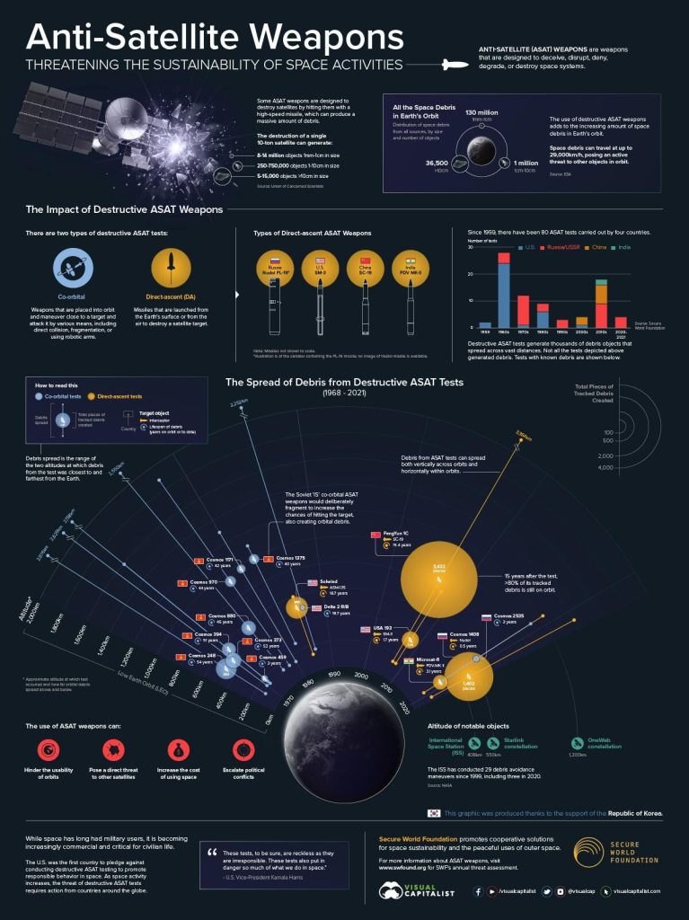 The Secure World Foundation’s infographic below demonstrates how destructive ASAT testing is blocking outer space and contributing to the growing amount of space debris in Earth’s orbits.