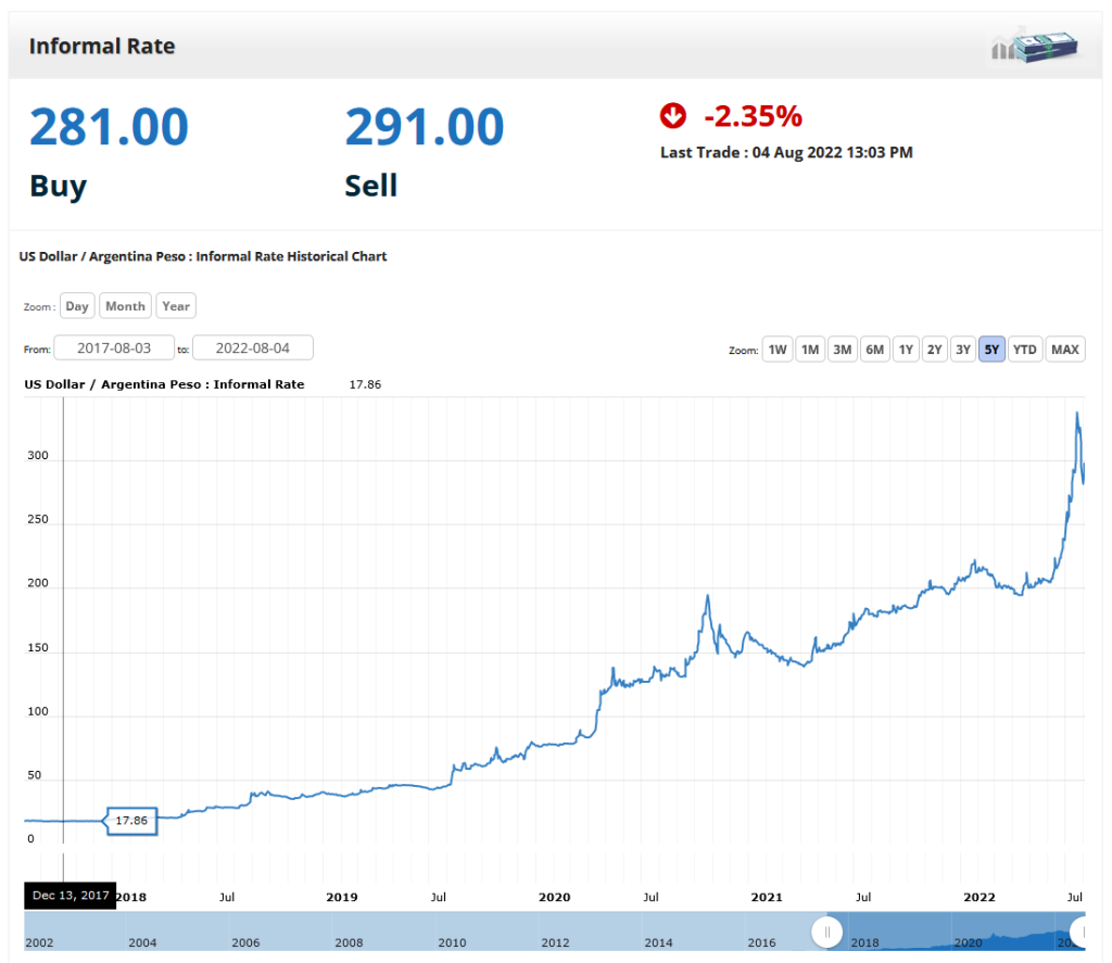 The price of the ‘blue dollar’ on the grey market for US dollars is currently trading at about 300/USD.