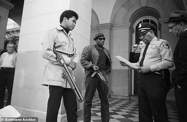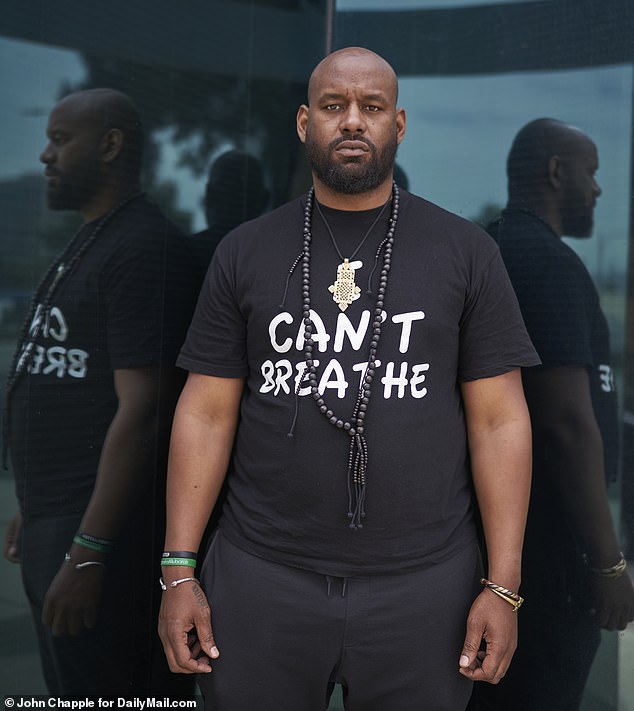 ‘We’re talking about self-defense. We’re talking about defending our communities,’ he explains. ‘You know what it’s like to see a taser pointed at a seven-year-old, you know what it’s like to see a 67-year-old black woman… pepper sprayed and pushed to the ground?’