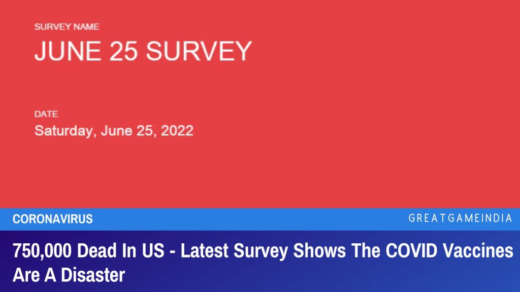 - 2.03% [1.7%-2.4%] of the households (10.18[8.6-11.8]/500) reported a death from the vaccine in their household [Q15]. This is stunning because it shows that the vaccine has killed almost as many people as the COVID virus has. The authorities say that COVID has killed over 1M people in the US so this suggests that 774,000 people were killed by the vaccine (10.18[8.6-11.8]/13.15[12.3-14.0]=77.4% [64.2%-90.5%]). How can that be a “safe” vaccine? The 95% confidence intervals say over 600,000 Americans have been killed by the vaccine. Even if this is overestimated by a factor of 10X, this is devastating for the vaccine narrative. There is simply no way to spin this. This is why the “fact checkers” and mainstream media will avoid this survey.