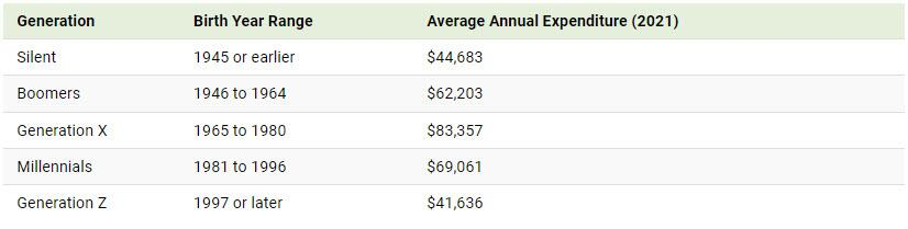Gen X (those born between 1965 and 1980) spent the most money overall in 2021, with an average annual expenditure of $83,357.