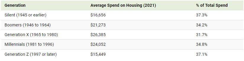 Housing is one of the most stable spending categories; it represents more than 30% of all annual spending across all age groups and is by far the largest expense.