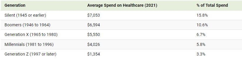 The table below reveals that the average healthcare expense for members of the Silent Generation was $7,053, or 15.8% of their overall average expenditure. Gen Z spent only $1,354 on average, or 3.3% of the overall average, in comparison.
