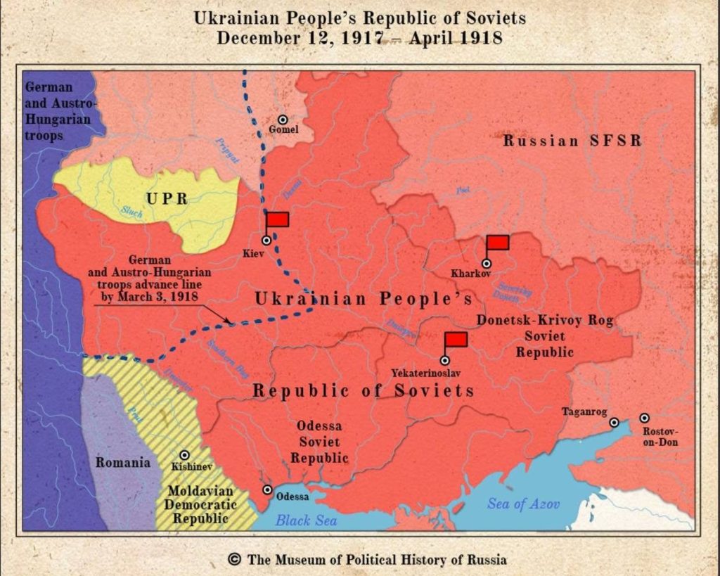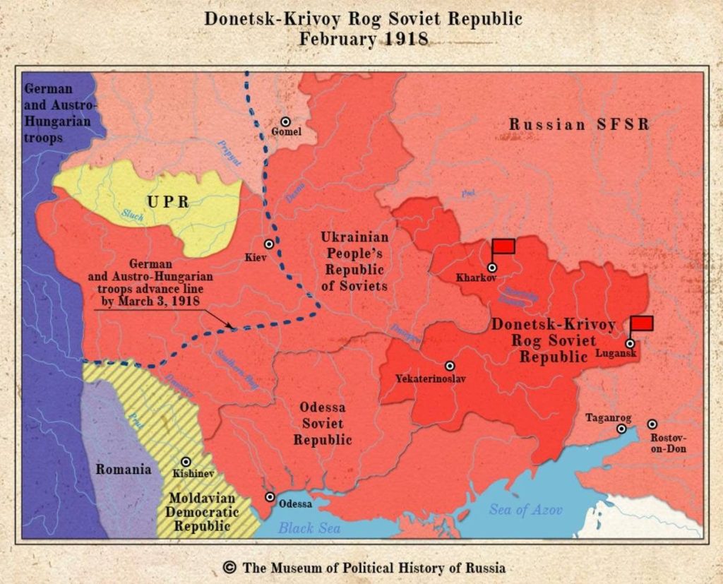 Another thing to be aware of is that, according to the Treaty of Brest-Litovsk, the Ukrainian People’s Republic (UPR) officially discontinued its participation in World War I and was promised military assistance to free its territory from Soviet Russian troops. The Donetsk–Krivoy Rog Republic was thus doomed as it would have been a part of the UPR by default. Yet, no substantial action was taken to eliminate the Soviet Ukrainian republics, five of which were technically in existence at the time (the Ukrainian, Odessa, Don, Donetsk, and Crimean). Soviet Russia signed its own Treaty of Brest-Litovsk with the Central Powers on March 3, effectively confirming the UPR boundaries set in the ‘Ukrainian’ Treaty of Brest-Litovsk.