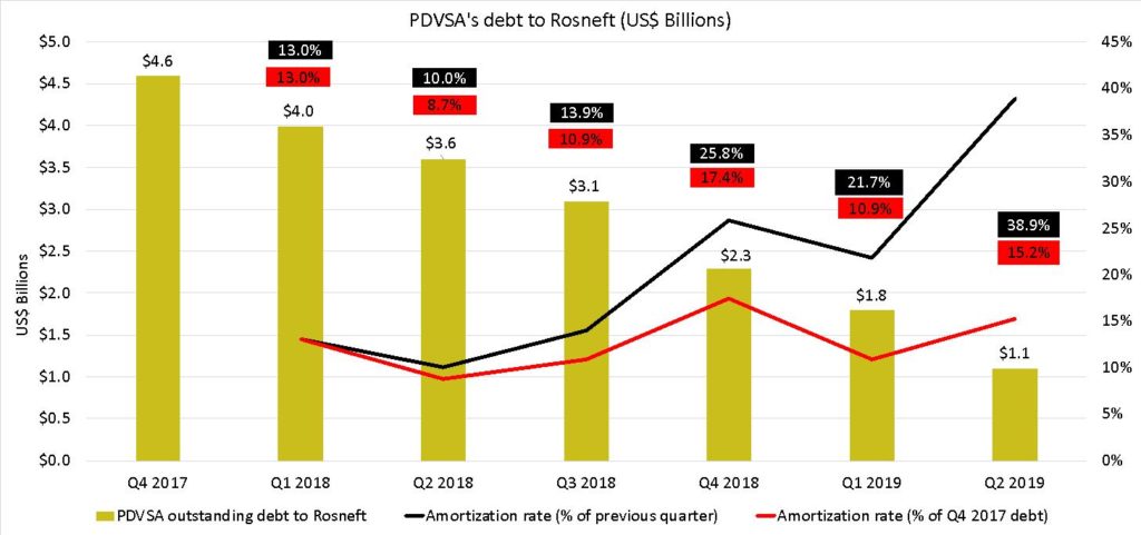 But Abrams did warn that Washington would have to look at Rosneft’s activity, a key warning. After all, the clock is running down on the tactic Rosneft has employed to continue handling Venezuelan oil despite Washington’s sanctions regime: the firm has stated that all of the Venezuelan crude it has received has been to service pre-paid agreements struck before US sanctions hindered such business. A look at Rosneft’s financials provides evidence to back up this claim. According to its quarterly reports, outstanding debt on these contracts has fallen sharply, from US$4.6 billion at the end of 2017, to US$1.1 billion at the end of this June.