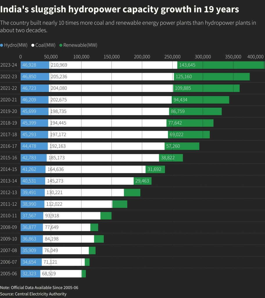 In the last 20 years, India has built fewer than 15 gigawatts of hydropower plants, while new coal and other renewable energy projects have been roughly ten times as large.