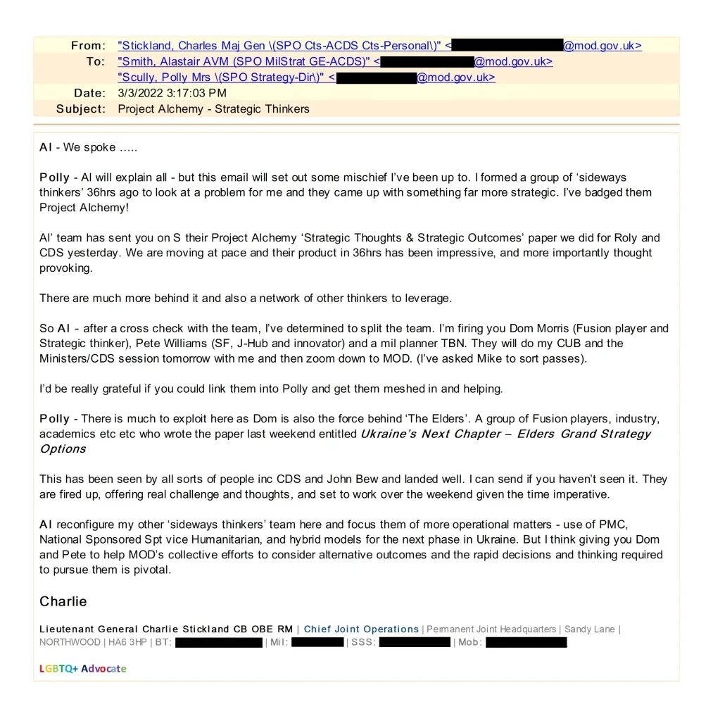 The group behind these plans, Project Alchemy, was set up by high-ranking British military officials just after Russia invaded Ukraine in 2022. They secretly met and devised ways to keep the war going and to make life harder for Russia. Their goal was clear: “Keep Ukraine fighting at all costs.”