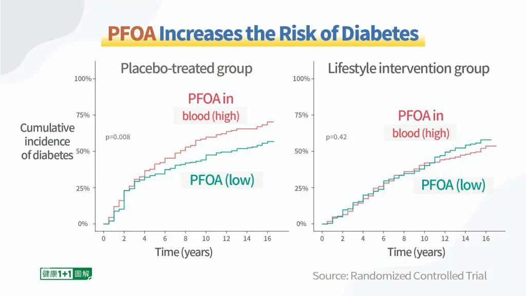 A decade-long study by American researchers on around 1,000 individuals revealed that a person’s chance of developing diabetes rose by 14% with every doubling of the level of PFOA in their blood.