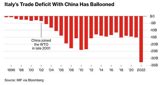 According to Bloomberg data, Italy’s trade deficit with China skyrocketed after the BRI agreement, increasing its reliance on Chinese imports.