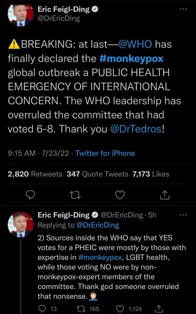 The declaration was made unilaterally, in direct contradiction of independent review panel advice, by WHO director Tedros Adhanom Ghebreyesus. Tedros made the declaration despite a lack of consensus among members of the WHO’s emergency committee on the monkeypox outbreak, and in so doing overruled his own review panel, who had voted 9 against, 6 for declaring the PHEIC.