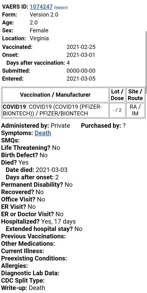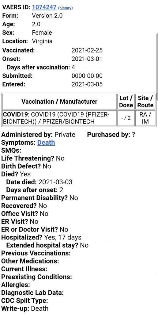 A two-year-old girl received her second (Dose 2) experimental Pfizer mRNA shot on February 25. She apparently developed some sort of serious adverse reaction on March 1. The baby was dead on March 3. No further details were provided.
