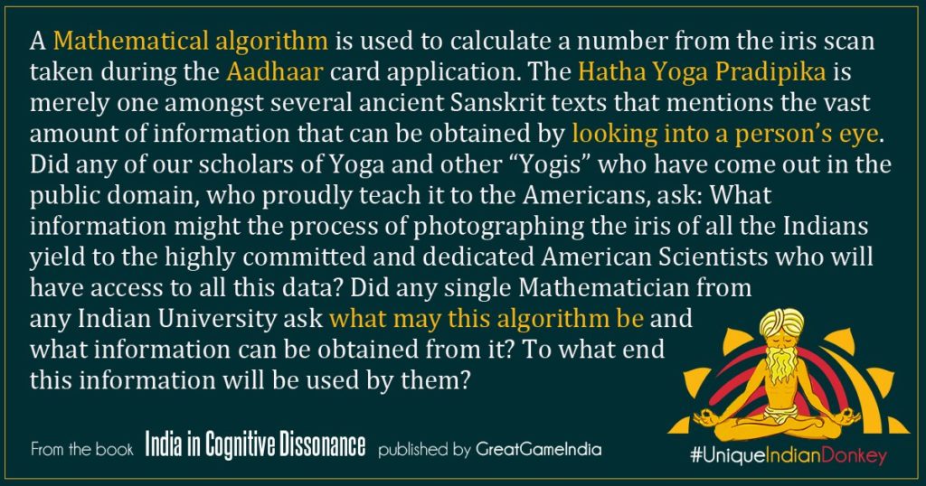 A Mathematical algorithm is used to calculate a number from the iris scan taken during the Aadhaar card application. The Hatha Yoga Pradipika is merely one amongst several ancient Sanskrit texts that mentions the vast amount of information that can be obtained by looking into a person’s eye.