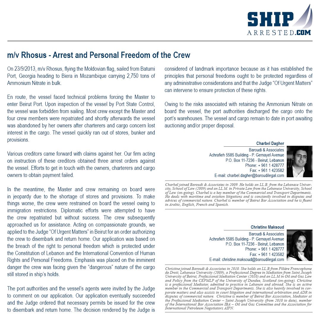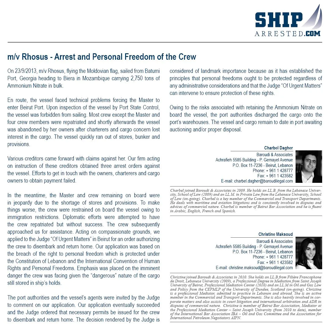 “Owing to the risks associated with retaining the ammonium nitrate on board the vessel, the port authorities discharged the cargo onto the port’s warehouses,” the lawyers wrote in a 2015 article published by shiparrested.com.