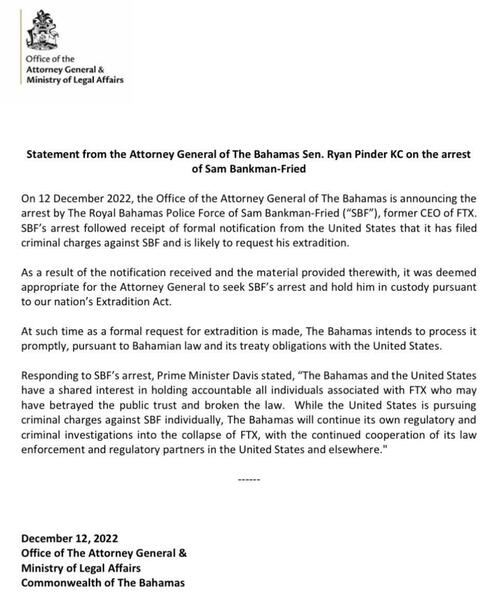 “As a result of the notification received and the material provided therewith, it was deemed appropriate for the Attorney General to seek SBF’s arrest and hold him in custody pursuant to our nation’s Extradition Act.