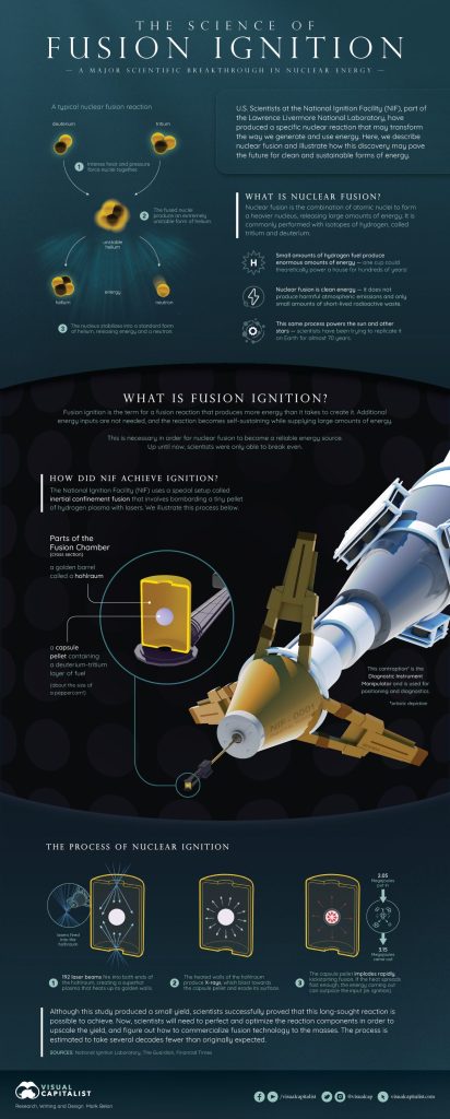 The following infographic by Mark Belan and Bruno Venditti of Visual Capitalist explains nuclear fusion and shows how this discovery can lead to the development of a brand-new clean and sustainable energy source in the future.