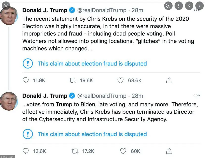 Krebs never explained the fact that vote counting in multiple swing states was halted for no apparent reason on Election Day. Nor has anyone explained why Trey Trainor, the chair of the Federal Election Commission, declared on TV on November 6th, 2020 that election “observers have not been allowed into the polling locations in a meaningful way” and that “if they’re not, the law is not being followed, making this an illegitimate election.”