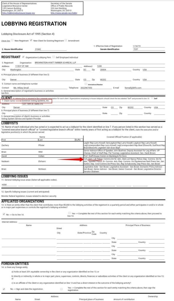 Next to its associations with George Soros, Dominion Voting Systems has numerous connections to the Democratic Party in the USA. The company hired Brownstein Hyatt Farber Schreck LLP, a lobbying firm. One of the directors of this lobbying firm is Nadeam Elshami, former chief of staff to Democratic Leader and Speaker of the United States House of Representatives Nancy Pelosi. Elshami is officially registered as a lobbyist for Dominion.