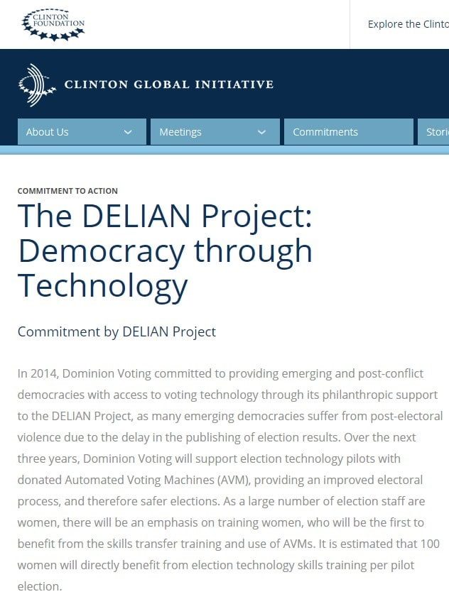 The Clinton Foundation is also connected to Dominion Voting Systems. In 2014 Dominion has made a donation to The Clinton Foundation to be used for the DELIAN Project.