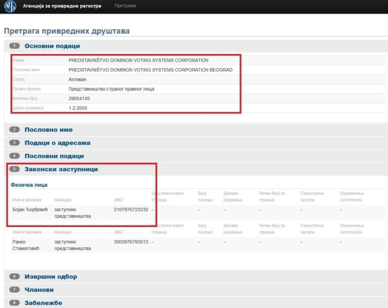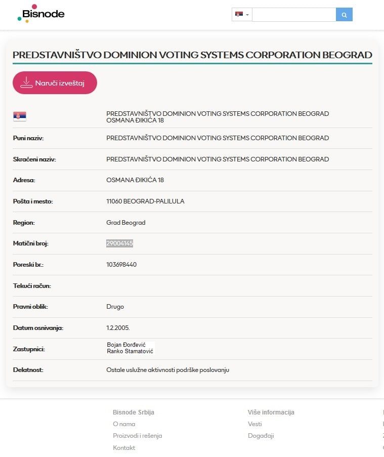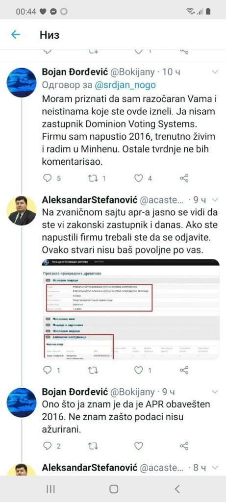 This of course is not true. The data we can find at the official site of Serbian Business Registers Agency (APR) confirms that Djordjevic is still (February, 2021) the legal representative and a responsible person in Serbian Representation of the company Dominion Voting Systems. Visibly scared Djordjevic then deleted his tweets and locked his twitter account.