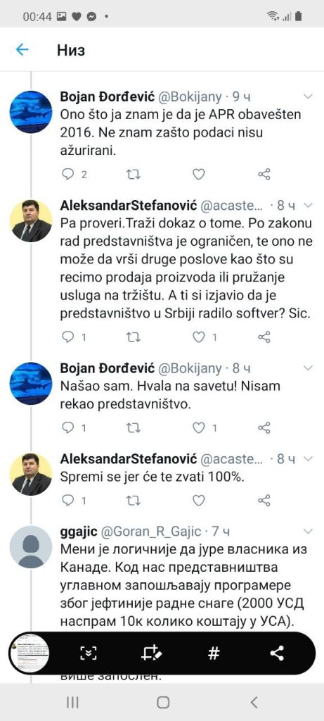 So, immediately after I have published the information that this software was written in Dominion Representation in Serbia and that he is its representative, he got scared so first, he blocked me, then he unblocked me, and then he tried to deny his connection to Dominion software claiming that he left the company two years ago and moved to Munich.