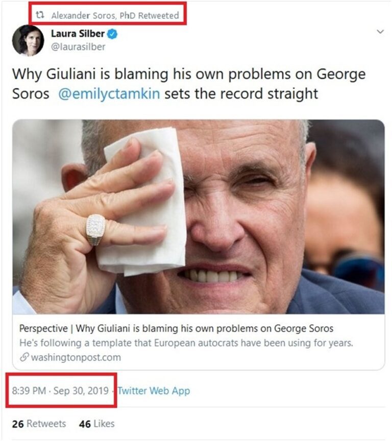 The author of this piece, a Washington Post journalist, tries to defend Biden and Soros, while attacking Giuliani and Trump, but the problem is that the facts speak differently. This article was retweeted by Alexander Soros, son of George Soros, which is logical, considering the fact that it was his father George who ordered this propaganda piece.