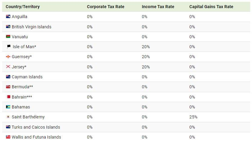 The majority of countries and territories that do not impose company taxes are small island states in the Caribbean, Pacific, and British Isles.