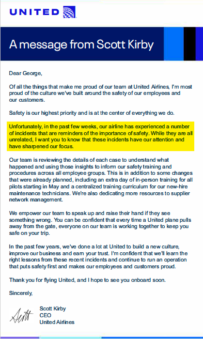 CEO Scott Kirby sent out a statement to customers saying, “Unfortunately, in the past few weeks, our airline has experienced several incidents that are reminders of the importance of safety.”