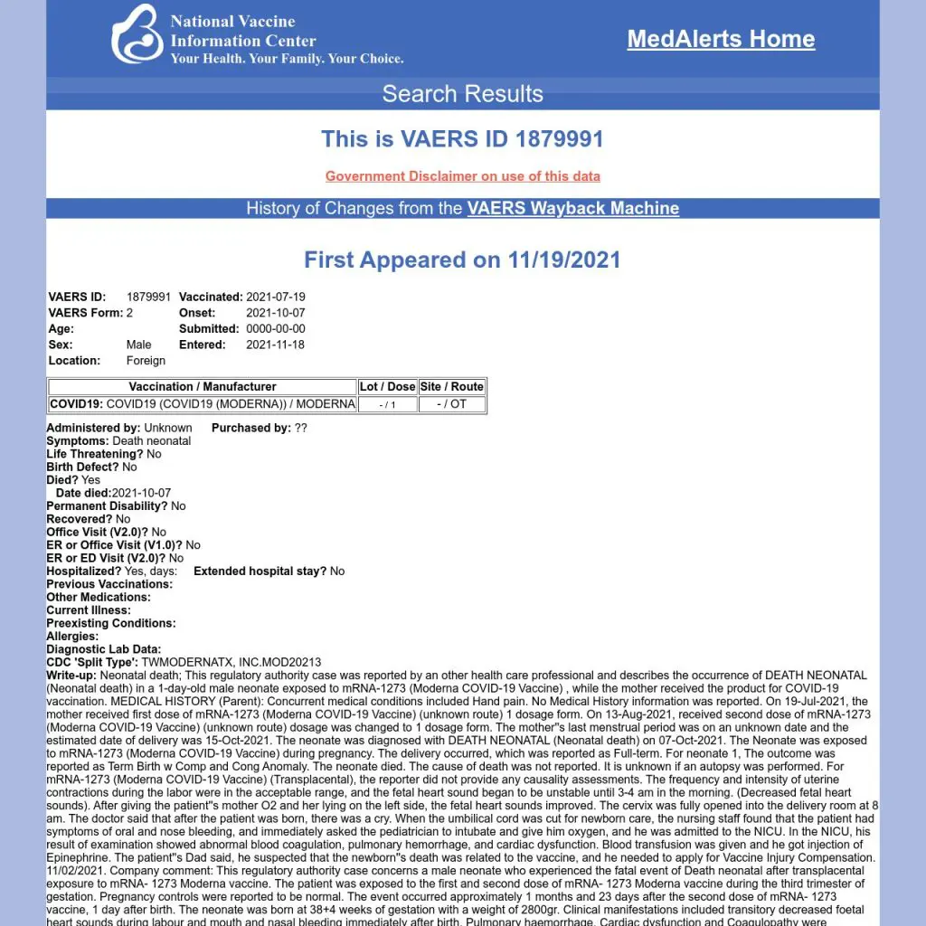According to the VAERS report (number 1879991) on death subsequent to “transplacental exposure” to the mRNA vaccine, it remains unknows if an autopsy was performed and if any cause of death was documented, but the infant’s father stated his open suspicion that the vaccine was related to the death.