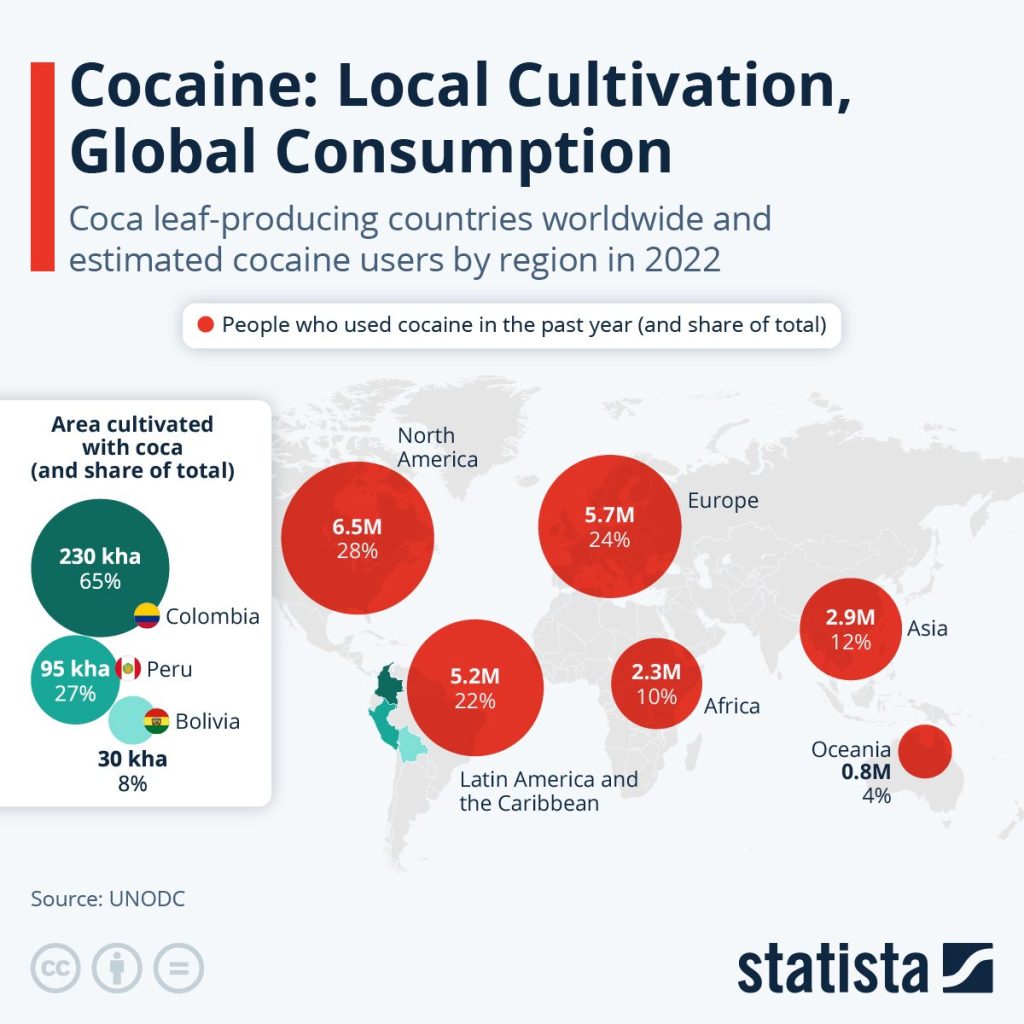According to the UNODC’s World Drug Report, the Americas account for over half of all estimated cocaine users globally, while Europe and Asia have 5.7 million and 2.9 million, respectively.