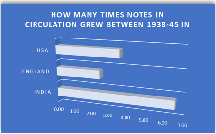 This bank, in fact, remained the primary source of British finances for the second world war as becomes glaringly evident by a comparative study of its assets and liabilities before the beginning of the war and after its end. For example, the RBI expanded the currency notes in circulation in India 6.57 times during the war, while the FED stretched the bills supply in the USA 3.69 times, and the Bank of England expanded the notes circulating in England 2.56 times only, over the same period.